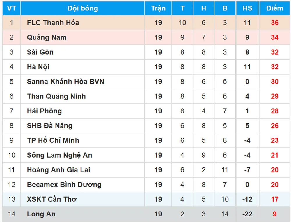 Bảng xếp hạng Toyota V.League 2017 - vòng 19