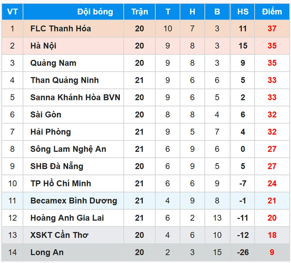 Bảng xếp hạng Toyota V.League 2017 vòng 21
