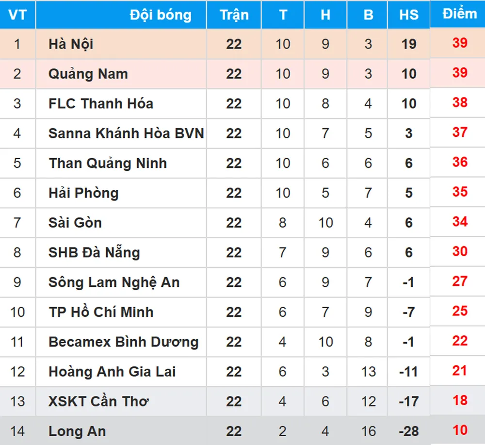 Ở trận đấu muộn của vòng 22, sau chiến thắng 4 - 0 trước Cần Thơ, CLB Hà Nội vượt qua Quảng Nam để giữ ngôi đầu bảng xếp hạng.