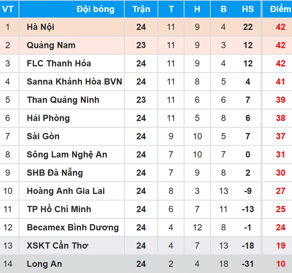 Bảng xếp hạng Vòng 24 - Toyota V.League 2017 (ngày 5-11)