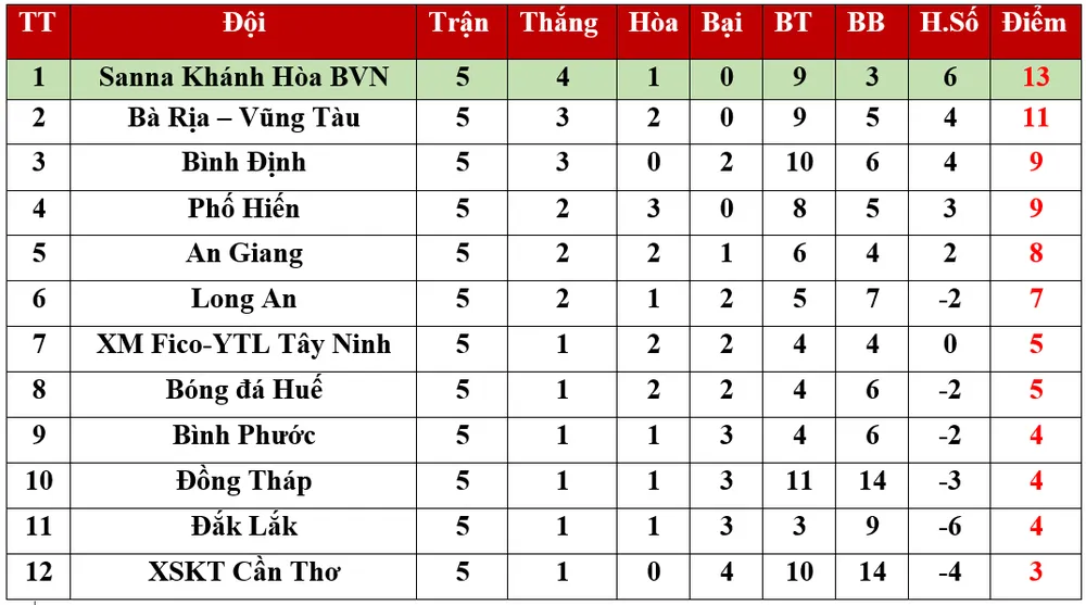 Với kết quả này, Sanna Khánh Hòa BVN vẫn bất bại với 13 điểm sau 5 vòng đấu nhưng chỉ còn hơn đội xếp nhì bảng là Bà Rịa - Vũng Tàu đúng 2 điểm.