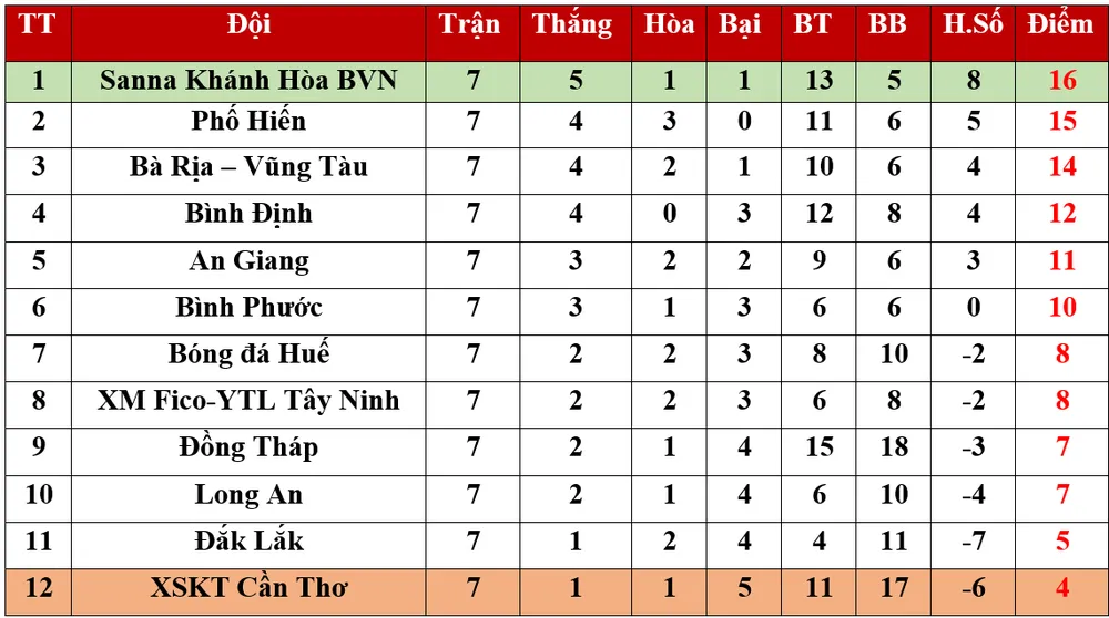 Trong khi đó, An Giang (11 điểm) tiếp tục xếp ở vị trí thứ 5. Bình Định duy trì vị trí thứ 4 với 12 điểm sau trận thắng trước Bóng đá Huế. Bà Rịa - Vũng Tàu để thua ở vòng đấu này, rơi xuống vị trí thứ 3 với 14 điểm.