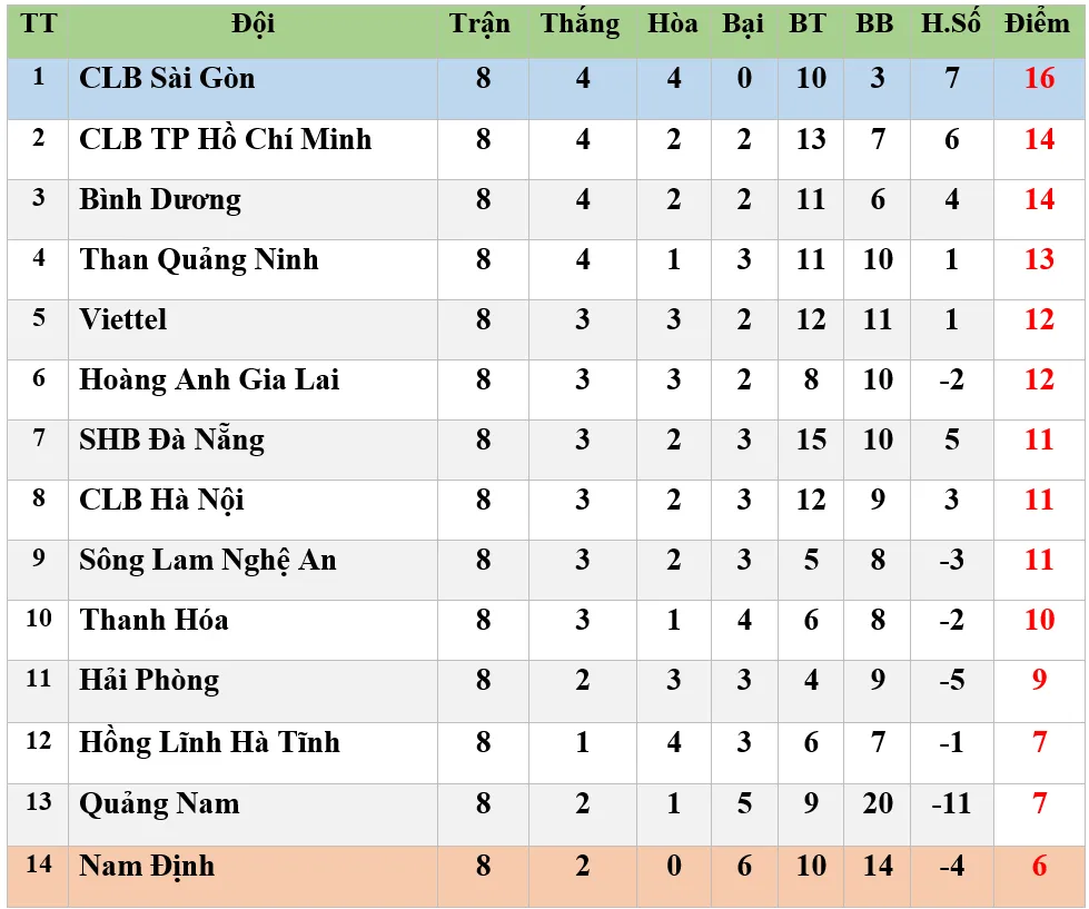 Bảng xếp hạng vòng 8: