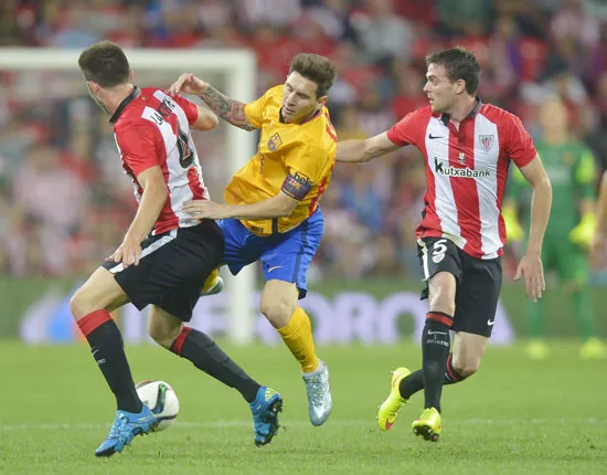 Messi (giữa) bất lực trước Laporte và Eraso (phải) trong trận lượt đi.