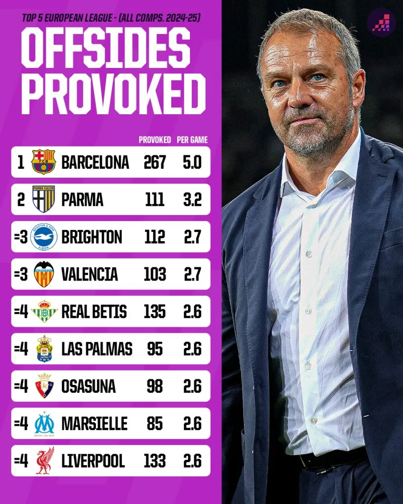 Trong tất cả các giải đấu mùa này, Barcelona đã khiến đối thủ rơi vào bẫy việt vị gần gấp đôi bất kỳ đội nào khác (267 lần – nhiều hơn 132 lần so với bất kỳ đội nào) trong số năm giải đấu hàng đầu châu Âu. Họ trung bình khiến đối thủ bị bắt việt vị 5.0 lần mỗi trận, trong khi chỉ có một đội khác (Parma, 3.2) trung bình hơn ba lần mỗi trận trong mùa giải này.