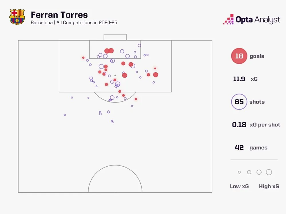 Điều bất ngờ là tỷ lệ bàn thắng mỗi 90 phút của Torres (tính cả thời gian bù giờ) là 0.86, cao hơn con số 0.76 của Lewandowski mùa này. Nhưng anh cũng phối hợp với đồng đội thường xuyên hơn, với tỷ lệ kiến tạo kỳ vọng mỗi 90 phút cao hơn (0.10 so với 0.06) và số cơ hội tạo ra từ bóng sống mỗi 90 phút (1.2 so với 0.7).