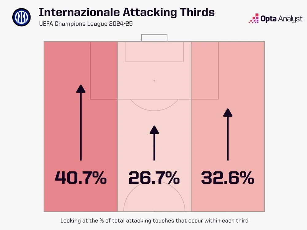Ở cánh phải, Darmian đã trông mệt mỏi trong những trận gần đây, và sẽ rất thú vị để xem liệu Inzaghi có tiếp tục sử dụng cầu thủ 35 tuổi này hay không, đặc biệt khi Dumfries đã trở lại sau chấn thương. Cầu thủ người Hà Lan trung bình thực hiện 3.4 quả tạt từ bóng sống mỗi 90 phút ở Champions League mùa này, nhiều nhất trong số các cầu thủ Inter. Chỉ có Lautaro Martínez, Marcus Thuram và Hakan Çalhanoglu ghi nhiều bàn hơn con số tám bàn của Dumfries cho Inter mùa này, vì vậy nếu anh được chọn, Inter sẽ có cả bàn thắng lẫn sự sáng tạo ở cả hai cánh.