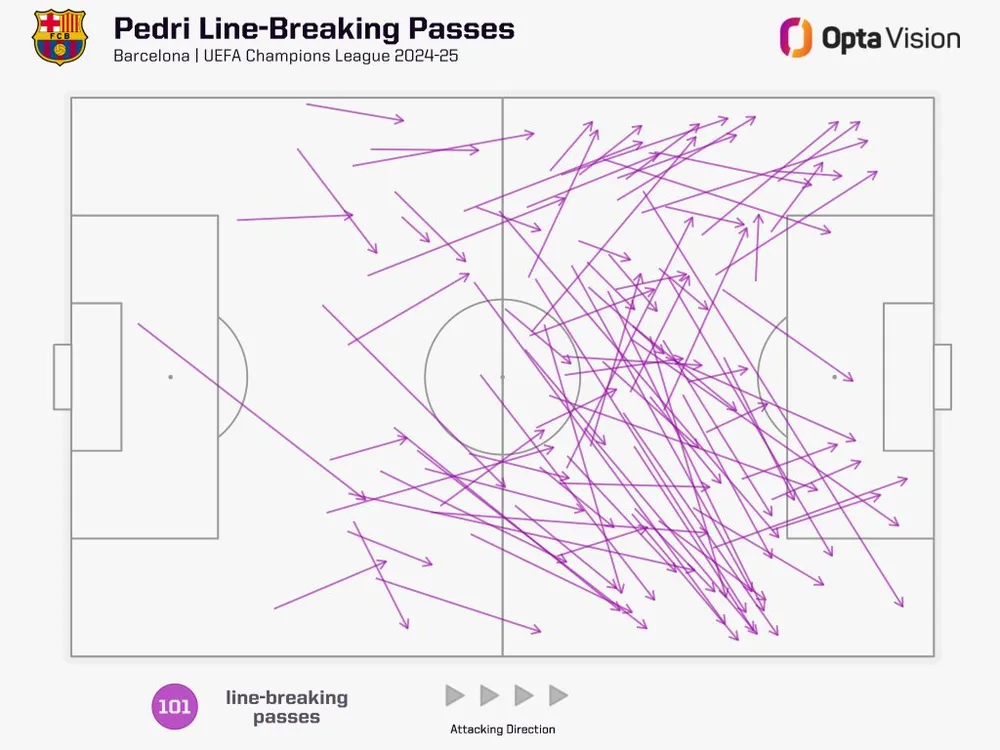 Tiền vệ đáng tin cậy này đã chơi 52 trong số 53 trận của Barcelona ở mọi đấu trường mùa này, và cầu thủ 22 tuổi có những con số để chứng minh niềm tin của Flick dành cho anh. Chỉ có Raphinha (109) tạo ra nhiều cơ hội từ bóng sống hơn Pedri (80) cho Barça ở mọi đấu trường mùa này. Và ở Champions League, chỉ có ba cầu thủ thực hiện nhiều đường chuyền phá tuyến dẫn đến nguy hiểm hơn – các đường chuyền tạo cơ hội cho cú sút, bàn thắng, quả tạt hoặc phạt góc trong vòng 10 giây – so với con số 29 của Pedri trong chiến dịch hiện tại.
