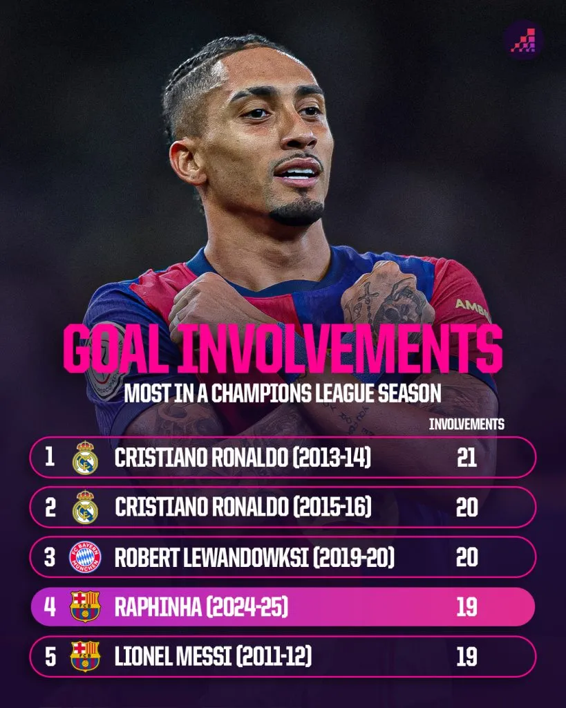 Bị Serhou Guirassy (13) vượt qua để trở thành vua phá lưới Champions League mùa này ở vòng trước, Raphinha (12) cần thêm năm bàn nữa qua hai trận bán kết và một trận chung kết tiềm năng để san bằng kỷ lục ghi nhiều bàn nhất trong một mùa UCL của Cristiano Ronaldo, được thiết lập vào mùa 2013-14 cho Real Madrid (17).