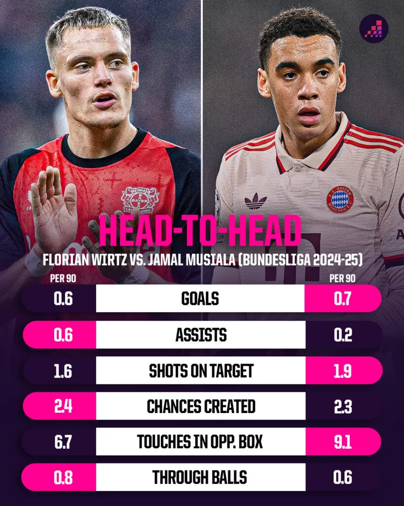 Florian Wirtz tiếp tục thể hiện đẳng cấp của mình. Anh có 22 lần tham gia vào bàn thắng tại Bundesliga mùa 2023-24 (11 bàn, 11 kiến tạo) và đã có 18 lần tham gia vào bàn thắng trong mùa giải này (9 bàn, 9 kiến tạo). Wirtz được đồn đoán sẽ chuyển đến Bayern Munich vào cuối mùa giải, nhưng trước mắt, anh sẽ muốn tỏa sáng và gây khó dễ cho họ trong trận đấu vào thứ Bảy tới.