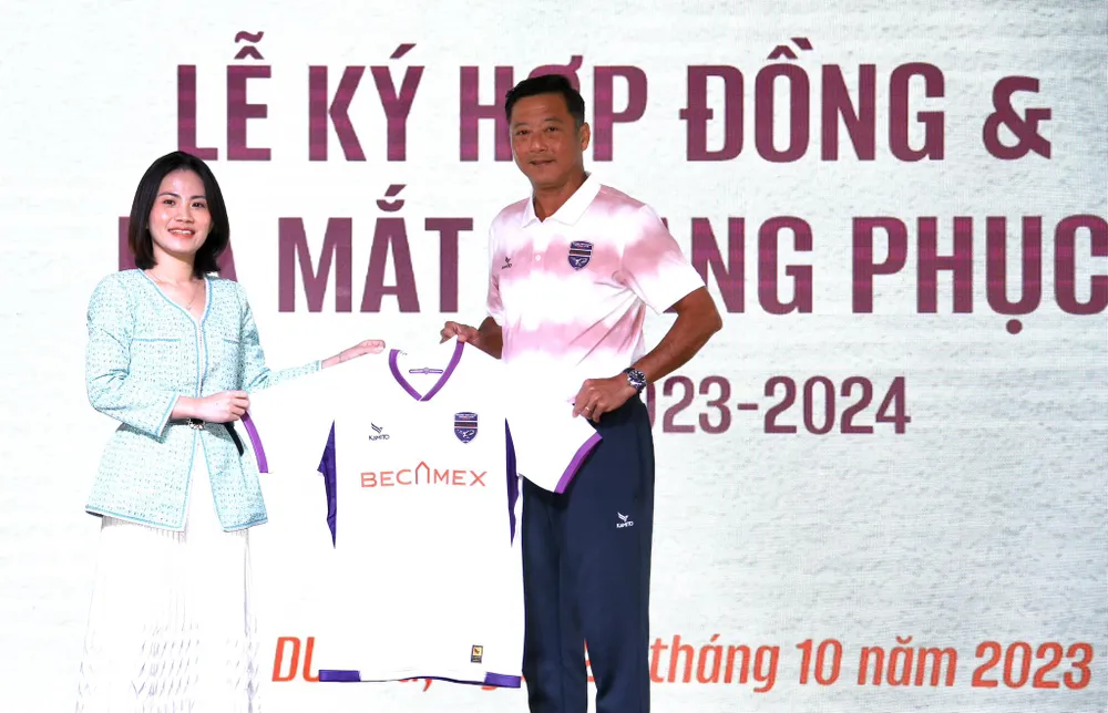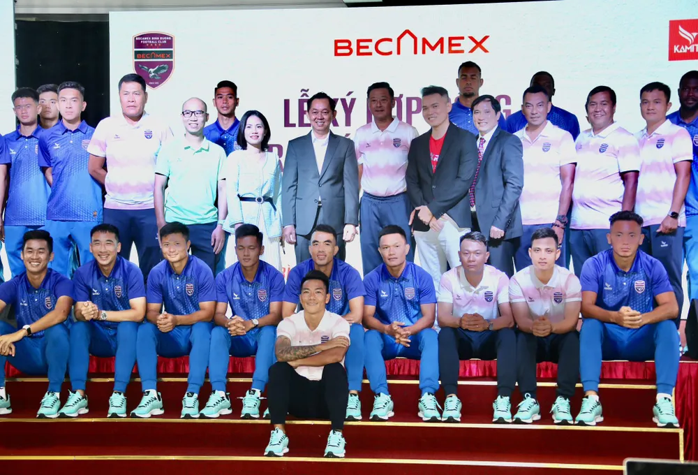 Chủ tịch CLB Becamex Bình Dương Hồ Hồng Thạch ký hợp đồng cùng đại diện nhà tài trợ trang phục Kamito trước mùa bóng mới |