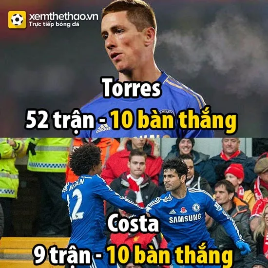 Fernando Torres - đá 52 trận cho Chelsea mới ghi được 10 bàn thắng, Diego Costa - đá 9 trận cho Chelsea đã có 10 bàn thắng. Sự so sánh về tính hiệu quả giữa Torres và Costa khi khoác áo The Blues của Fan Page Thức Khuya Xem Bóng Đá đang khiến cho cư dân mạng sôi sục. Những CĐV hâm mộ Torres tỏ ra rất bức bối khi thần tượng của họ bị so sánh kiểu như thế này.