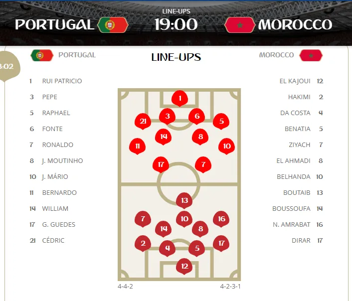 Morocco tung đội hình y hệt trận trước, dù thay đổi lối chơi tấn công phóng khoáng bằng hệ thống phòng thủ chặt chẽ với hy vọng phong tỏa được Cristiano Ronaldo. Tuy nhiên, các hậu vệ Morocco đã quá non nớt, để Ronaldo dễ dàng lao vào ghi bàn từ một quả treo bóng từ cánh phải.