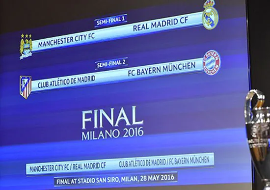 Lễ bốc thăm vòng Bán kết UEFA Champions League mùa này đã diễn ra tại Nyon (Thụy Sĩ). Bốn đội mạnh nhất của mùa này là Real Madrid, Man City, Bayern Munich và Atletico Madrid.