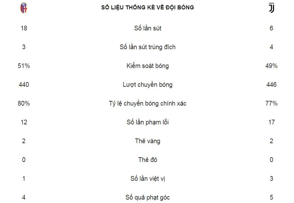 Mọi nổ lực ghi bàn của Ronaldo đều bị ngăn cản và HLV Allegri quyết định thay Dybala vào sân và tiền đạo người Argentina lập tức tỏa sáng ở phút 67 và thêm phần xuất sắc của thủ thành Perin mới có thể giành 3 điểm đầy khó khăn trên sân Bologna.
