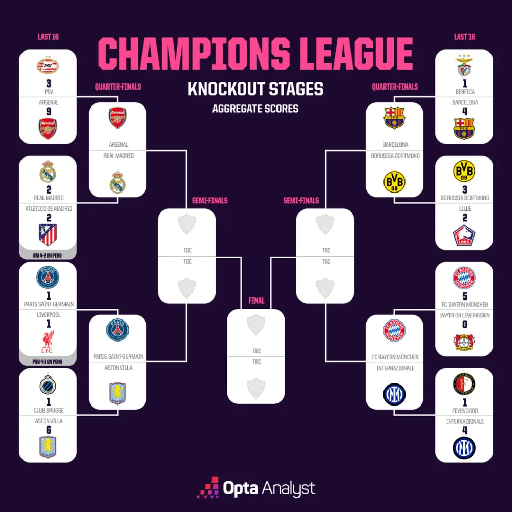 Theo siêu máy tính Opta, Barcelona, PSG và Inter đều là ứng cử viên sáng giá để thắng trận tứ kết của mình, trong khi Real Madrid chỉ hơi nhỉnh một chút trước Arsenal (50,2% so với 49,8%). Vì vậy, nếu tin vào siêu máy tính, rất có thể chúng ta sẽ thấy bốn đội này ở bán kết.