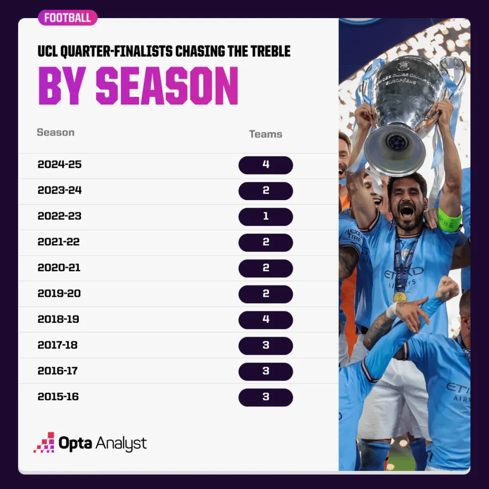 Điều này có nghĩa là đây là lần đầu tiên sau bảy mùa giải, bốn đội bóng vào tứ kết Champions League vẫn còn cơ hội giành cú ăn ba. Lần cuối cùng là mùa 2018-19, khi Manchester City, Barcelona, Porto và Ajax lọt vào tám đội mạnh nhất châu Âu trong khi vẫn đang cạnh tranh danh hiệu quốc nội và tiến gần đến vinh quang cúp quốc gia.