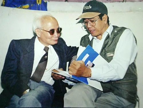 Huyền thoại Mai Duy Dưỡng (trái) và nhà báo Nguyễn Lưu trò chuyện ở 1 giải đấu bóng bàn. Ảnh: Phan Sang
