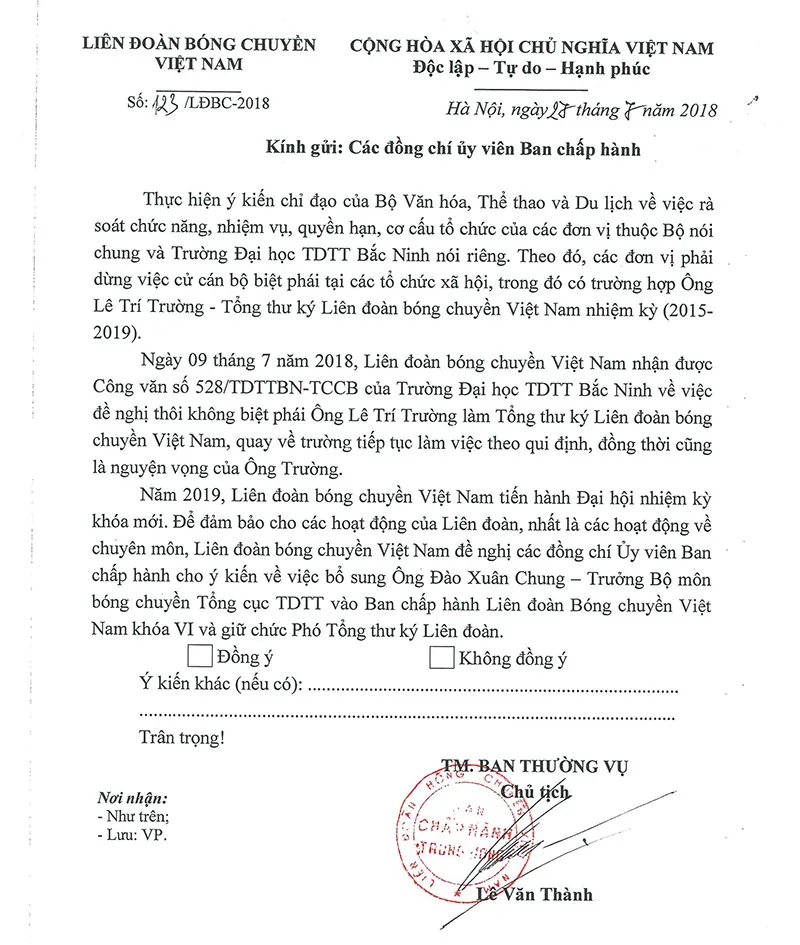 Một số uỷ viên hơi choáng trước cách làm việc có phần vội vã và như thể “bị ấn vào tay” tờ văn bản thông báo nói trên (được đích thân ông Chủ tịch VFV Lê Văn Thành ký) và được hối thúc hoàn thành sớm để gửi trả lại liên đoàn. Kèm theo đó, VFV nhấn mạnh “đây là nguyện vọng của chính ông Lê Trí Trường”, tức là VFV chỉ đưa ra động thái tiếp sau hành động của ông Trường, vị Tổng thư ký kể từ ngày nhận chức đến nay bị giới làm nghề đánh giá là luôn bị cô lập, không được tham gia quyết định không ít vấn đề quan trọng của bóng chuyền nước nhà.