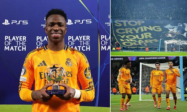 Trước trận lượt đi vòng play-off tại sân Etihad, các cổ động viên Man City đã giương lên một tấm biểu ngữ lớn chế nhạo Real Madrid và tiền đạo Vinícius Júnior vì những phản ứng quá mức của CLB Hoàng gia hồi để thua tiền vệ Rodri của Man City trong cuộc đua giành Quả bóng vàng 2024.