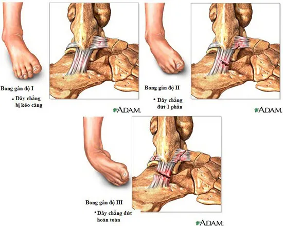 Bong gân nhẹ (độ I): đau vừa, sưng tại chỗ, vẫn đi lại được. Thời gian lành hoàn toàn khoảng 4-6 tuần.