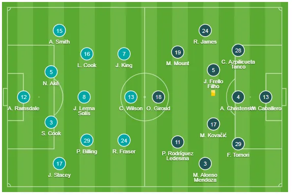 Jefferson Lerma đẻ Kovacic để đánh đầu tung lưới 2-1 Phút 57, Joshua King đệm bóng dễ dàng ơ cột xa sau đường chuyền ngang mặt thành của Jack Stacy.