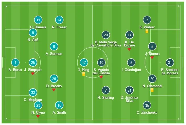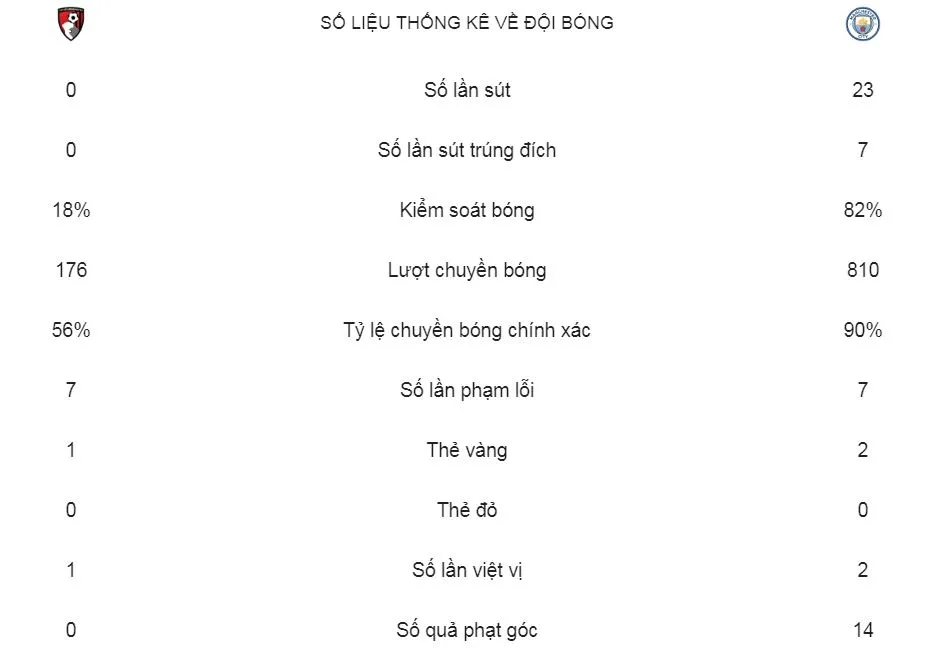 Man City khống chế thế trận ngay từ đầu nhưng hàng thủ Bournemouth quá chắc chắn. Phút 55, Silva nhả bóng cho Mahrez tung cú đá góc đánh bại thủ thành Boruc. Thắng 1-0, đoàn quân HLV Pep Guardiola tạm đứng đầu BXH Premier League với 71 điểm, hơn Liverpool 2 điểm trước khi đội này thi đấu vào tối Chủ Nhật.