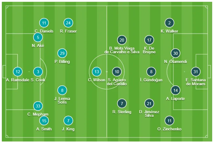 Đội hình thực tế trên sân của Bournemouth (trái) và Man City (phải)