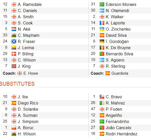 Phút 34, Bournemouth rót bóng từ biên phải vào giữa, các tiền đạo không theo kịp và trung vệ áo xanh Otamendi chủ quan hứng ngực để bóng văng ra ngay sát vạch phát bóng - một pha bóng dọn cỗ cho Adam Smith băng vào dứt điểm từ 6 thước nhưng bóng chạm trúng đầu thủ thành Ederson, bay vọt xà.