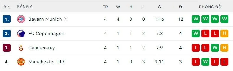 Đội bóng của Erik ten Hag có vẻ khó thể tiếp tục chơi Champions League trong năm mới sau thất bại 3 trong 4 trận đấu ở bảng A khiến họ đứng cuối bảng. Man United đã thua trên sân Bayern Munich, Copenhagen và thua Galatasaray trên sân nhà, đồng nghĩa với việc một thất bại nữa ở Istanbul vào thứ Tư sẽ chấm dứt giấc mơ Champions League của họ trước vòng đấu cuối cùng.