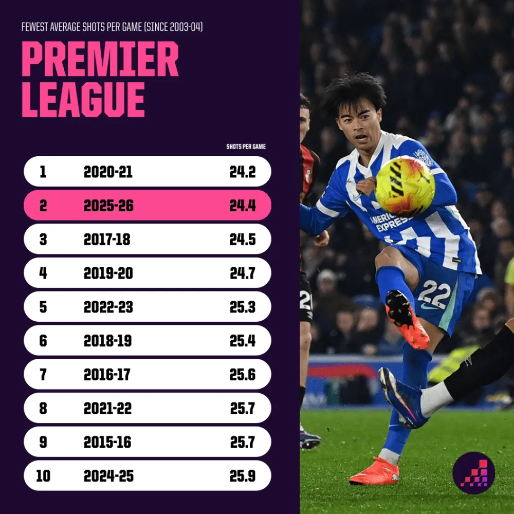 Các đội vẫn tạo nhiều cơ hội gần khung thành (16.7 cú sút trong vòng cấm – mức cao), nhưng phòng ngự dày đặc, chặn đường sút hiệu quả hơn. Sút xa giảm kỷ lục (dưới 8 cú/trận). Số lần chạm bóng trong vòng cấm đối phương vẫn cao (50.3/trận – thứ ba lịch sử), cho thấy các đội cố gắng tiếp cận nhưng khó xuyên thủng. Tỷ lệ chuyển hóa cú sút vẫn tốt (11.2% – mức cao), nên vấn đề không phải dứt điểm kém mà là thiếu cơ hội rõ ràng do phòng ngự chắc chắn và lối chơi thận trọng.