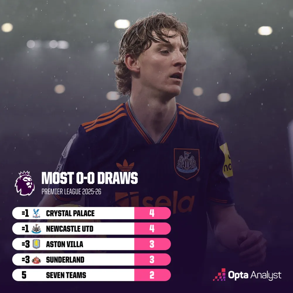 Premier League từng là sân khấu của những cơn mưa bàn thắng. Nhưng mùa này, tỷ lệ trận hòa 0-0 đang ở mức cao nhất trong 5 năm: 7,7% tổng số trận, tương đương 17 trận không bàn thắng tính đến giữa tháng 1 – nhiều hơn cả mùa 2024-25 (16 trận) và gần gấp đôi mùa 2023-24 (11 trận), mùa có tỷ lệ 0-0 thấp nhất lịch sử với chỉ 2,9%.