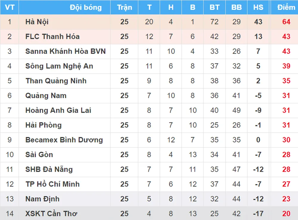XSKT Cần Thơ để thua CLB Hà Nội và tiếp tục nằm ở vị trí chót bảng với 20 điểm. Nam Định thắng Bình Dương và xếp áp chót với 23 điểm.