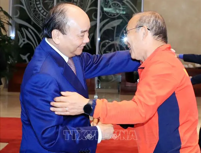 Thủ tướng Nguyễn Xuân Phúc bắt tay chúc mừng HLV trưởng đội U22 Việt Nam Park Hang Seo. Ảnh: TTXVN