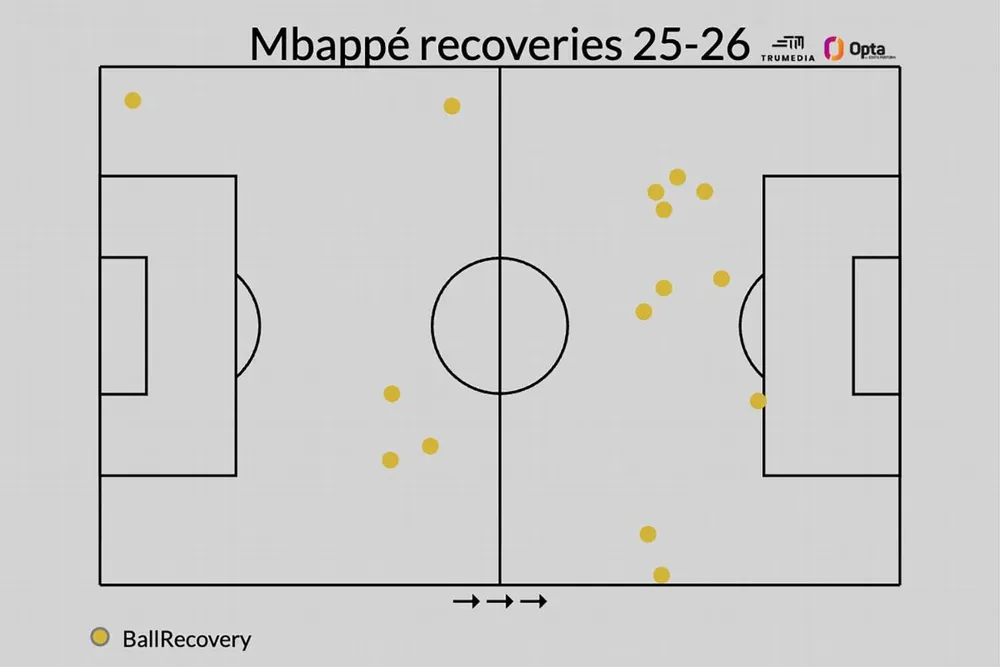 Một số chỉ số cho thấy sự thay đổi trong lối chơi không bóng của Mbappé là dần dần, chứ không phải đột ngột. Ở LaLiga, Mbappé thực hiện 12,47 lần pressing bóng mỗi 90 phút ở mùa 2025-26, so với 12,41 ở 2024-25, theo dữ liệu từ LaLiga Football Intelligence. Pressing cường độ cao của anh chỉ tăng nhẹ, lên 9,39 mỗi 90 phút, so với 8,89 mùa trước. Pressing bóng của Mbappé dẫn đến giành lại bóng là 3,24 mỗi 90 phút ở 2025-26, tương tự 3,49 mỗi 90 phút ở 2024-25. Và tỷ lệ thời gian anh đi bộ trong trận LaLiga vẫn ổn định ở 77%.