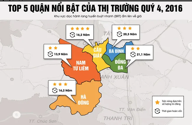 3 tháng cuối năm 2016, nhờ thông tin về dự án BRT dự kiến hoạt động năm 2017, một số quận dọc hành lang của tuyến này rục rịch biến động về giá. Quý 4 này, các quận Ba Đình, Đống Đa, Cầu Giấy, Hà Đông và Từ Liêm đều ghi nhận mức tăng về giá bán và cho thuê. Giá bán các căn hộ quận Đống Đa quý 4 dao động 34,8 triệu đồng/m2, tăng 6% so với quý trước. Quận Ba Đình có giá bán căn hộ trung bình vào khoảng 36,9 triệu đồng/m2, giá cho thuê bình quân 8,9 triệu đồng/tháng cho căn 2 phòng ngủ.
