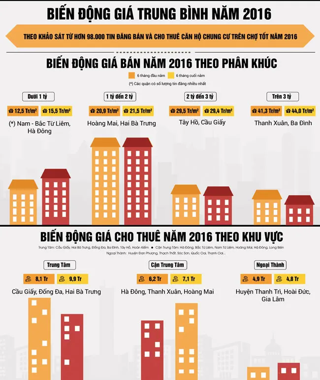 Giá bán các căn hộ chung cư Hà Nội trong năm 2016 ghi nhận nhiều thay đổi, phụ thuộc chủ yếu vào kết cấu hạ tầng giao thông của thủ đô. Mức biến động đáng kể thuộc về các căn hộ bình dân dưới 1 tỷ đồng. So với 6 tháng đầu năm 2016, giá bán căn hộ phân khúc này đã tăng 20- 24% (từ trung bình 12,5 triệu lên 15,5 triệu đồng/m2). Trong đó, sự phân bố các phân khúc căn hộ chung cư tương đối rõ: khu vực trung tâm tiêu biểu (3 quận Tây Hồ, Ba Đình và Cầu Giấy) chủ yếu các căn hộ cao cấp trên 3 tỷ đồng. Trong khi đó, khu cận trung tâm (Từ Liêm, Hà Đông, Long Biên và Hoàng Mai) lại có nhiều căn hộ phân khúc 1- 2 tỷ đồng.