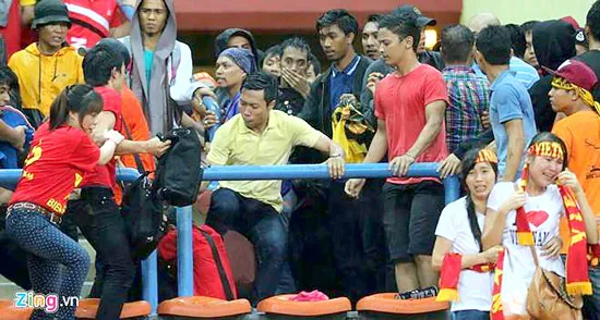 Khoảng thời gian cuối trận đấu, do cay cú khi đội nhà bị dẫn tỷ số, nhiều CĐV Malaysia đã tràn sang khu vực dành cho CĐV Việt Nam trên sân Shah Alam để tấn công (ảnh).