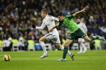 Kroos (trái) đi bóng trước nỗ lực bám đuổi của Pablo Hernandez