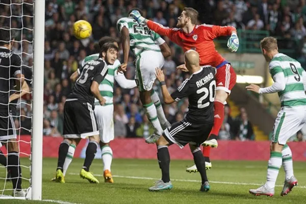 Dedryck Boyata (Celtic) bật cao đánh đầu ghi bàn vào lưới thủ môn Ibrahim Sehic (áo đỏ, Qarabag FK). Ảnh: EUFA.Com