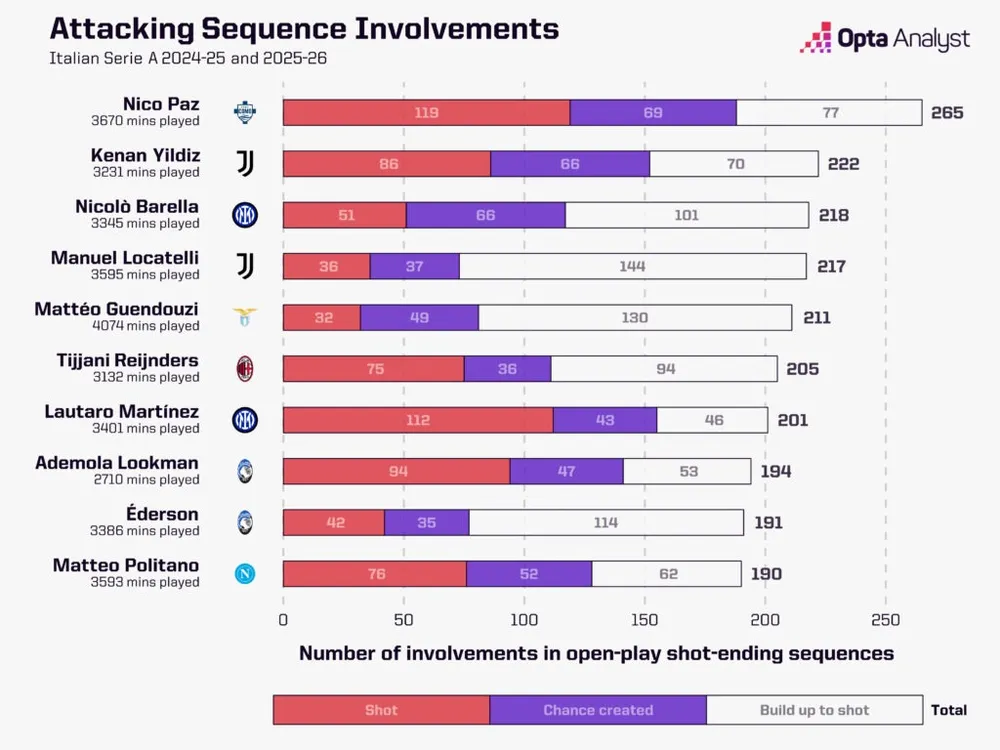 Nhân vật làm nên sự khác biệt là Nico Paz. Tiền vệ 21 tuổi này đã trở thành bánh răng tấn công có ảnh hưởng nhất của Fabregas. Hoạt động giữa các tuyến trong vai trò số 10, Paz mang lại sức sống cho toàn bộ cấu trúc của Como. Anh là cầu thủ duy nhất có mặt trong ít nhất 43 chuỗi tấn công kết thúc bằng cú sút nhiều hơn bất kỳ cầu thủ nào khác tại Serie A kể từ đầu mùa trước (265).