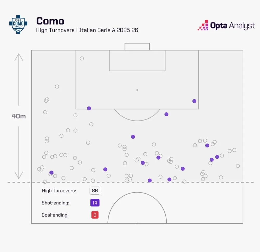 Khả năng gây khó chịu của Como đến từ việc họ cho phép đối thủ quá ít không gian để triển khai bóng. Họ phạm lỗi nhiều thứ hai tại Serie A (180 lỗi), một bằng chứng nữa về khát khao phá vỡ nhịp điệu của đối phương bất cứ khi nào có thể. Cấu trúc của Fabregas khiến đối thủ gặp khó khăn trong việc đưa bóng lên phía trước nhanh hơn bất kỳ đội bóng nào khác ở Serie A (1.99 mét/giây).