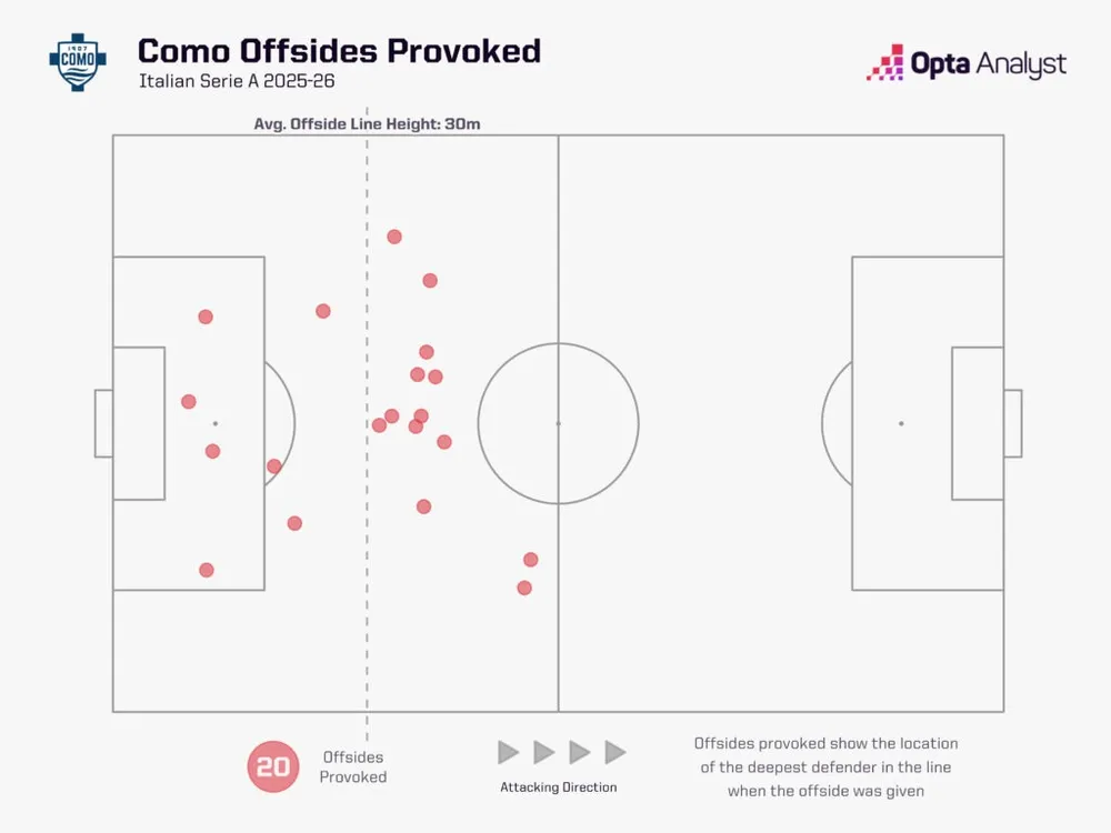 Họ thủng lưới ít thứ hai (6 bàn) và đã vượt trội hơn đáng kể so với chỉ số bàn thua kỳ vọng (xGA) là 10.37. Điều quan trọng là họ không chỉ dựa vào việc phòng ngự trong vòng cấm. Como phòng ngự cao, bắt việt vị đối thủ trung bình ở khoảng cách 30 mét so với khung thành của họ – cao thứ ba tại Serie A. Đó là dấu hiệu rõ ràng của một đội bóng quyết tâm giữ đối thủ xa khung thành mình nhất có thể.