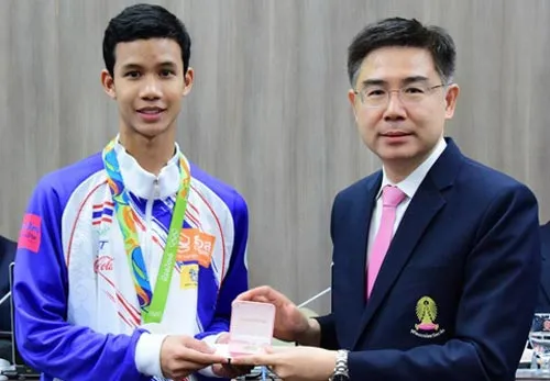 GS. Bundhit Eua-Arporn, Hiệu trưởng Đại học Chulalongkorn, trao huy chương danh dự cho VĐV Tawin Hanprab.
