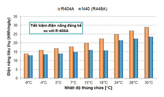 Chất làm lạnh chiếm tới 60% tổng điện năng tiêu thụ tại cửa hàng, bởi vậy tiết kiệm năng lượng trở thành nhu cầu cấp thiết đối với siêu thị và các cửa hàng tiện lợi. Solstice N40 có chỉ số nguy cơ gây nóng lên toàn cầu là 1273, thấp hơn 68% so với R-404A là 3943. Sản phẩm giúp tiết kiệm chi phí vận hành bằng việc giảm thiểu năng lượng tiêu thụ tới 16% (theo khảo sát vận hành tại các siêu thị tại châu Âu và Hoa Kỳ), và được kỳ vọng sẽ đạt mức giảm 40% lượng khí thải Carbon Dioxide (CO2) trong 4 năm tới.