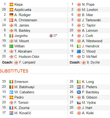 Jorginho sút phạt đền 2-0 Phút 38, hậu vệ phải Reece James dâng cao đến sát biên ngang trước khi tạt căng vào giữa, nơi Tammy Abraham bật lên giữa 2 hậu vệ để đánh đầu bật đất vào lưới.