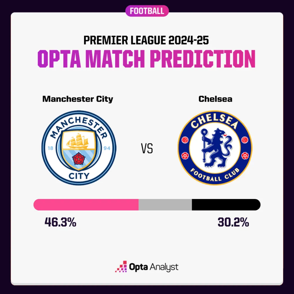 Man City được coi là đội được đánh giá cao hơn trong trận đấu vào thứ Bảy, nhưng với việc nhà vô địch được đánh giá có xác suất chiến thắng là 46,3%, siêu máy tính không loại trừ khả năng Chelsea sẽ giành chiến thắng.