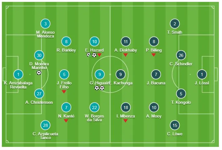 HLV Maurizio Sarri có vài sự thay đổi và Chelsea chơi áp đảo ngay từ đầu. Tân binh Higuain tỏa sáng bằng cú đúp bàn thắng và cựu binh Hazard cũng không chịu thua kém, bàn thắng ấn định chiên thắng 5 sao do công của David Luiz. Thắng 5-0, Chelsea tạm vượt qua Arsenal để lấy lại vị trí thứ 4 với 50 điểm, hơn Arsenal 3 điểm.