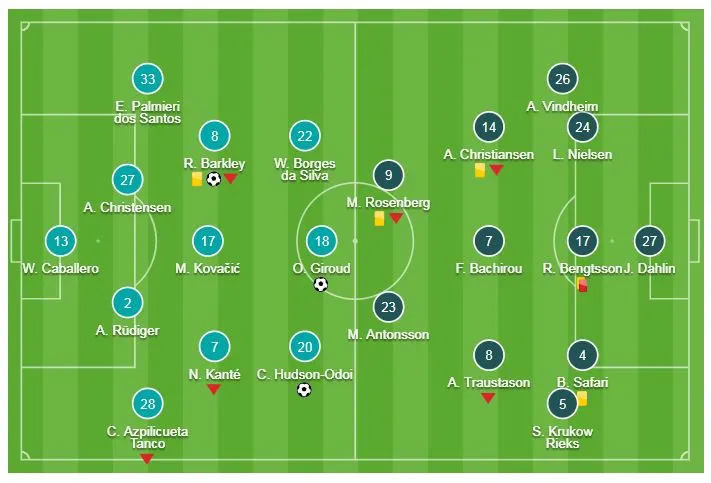 Lượt đi Chelsea thắng 2-1 nên HLV Sarri để Hazard, Luiz, Jorginho, Higuain ngồi dự bị cũng đủ có kết quả đậm đà 3-0 trước Malmo. 3 bàn thắng của Giroud, Barkley, Odoi ấn định chiến thắng chung cuộc 5-1 cho The Blues, qua đó giành vé vào vòng 1/8 Europa League 2018-2019.