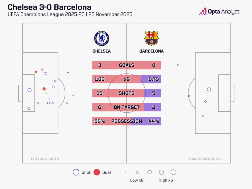 Chiến thắng toàn diện 3-0 trước Barcelona vào tối thứ Ba là lời khẳng định đanh thép nhất về khả năng cạnh tranh của họ tại châu Âu mùa này. Chelsea chơi áp đảo từ đầu đến cuối. Dù chiếc thẻ đỏ của Ronald Araújo ở cuối hiệp một khiến công việc của họ dễ dàng hơn, nhưng ngay cả trong 44 phút còn lại khi tỷ số là 11 đấu 11, đội chủ nhà đã hoàn toàn vượt trội so với gã khổng lồ Barcelona. Họ xứng đáng có một chiến thắng lớn hơn cả con số 3-0, khi ba bàn thắng khác đã bị từ chối. Kết quả này đưa Chelsea vượt qua Barcelona và theo Siêu máy tính Opta, cơ hội vô địch Champions League của họ đã tăng lên 5.5%. Đây là một tỷ lệ không tưởng chỉ vài tuần trước.